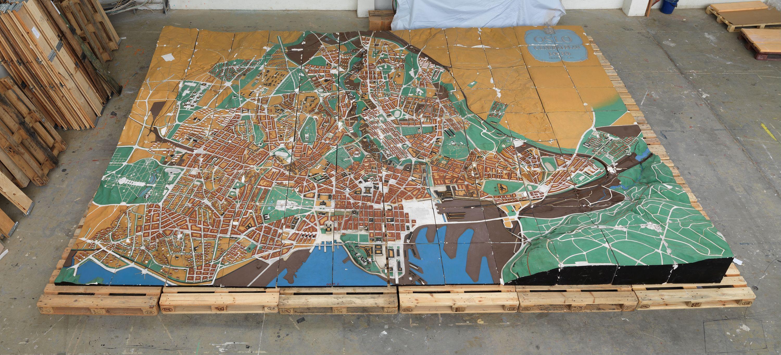 Oslo 1930, bymodellen, ofte kalt «Harald Hals´ bymodell», her under restaurering og montering i byggehallen på AHO. Oslo er en collage av ulike morfologier, og bydelene vises tydelig på modellen.
