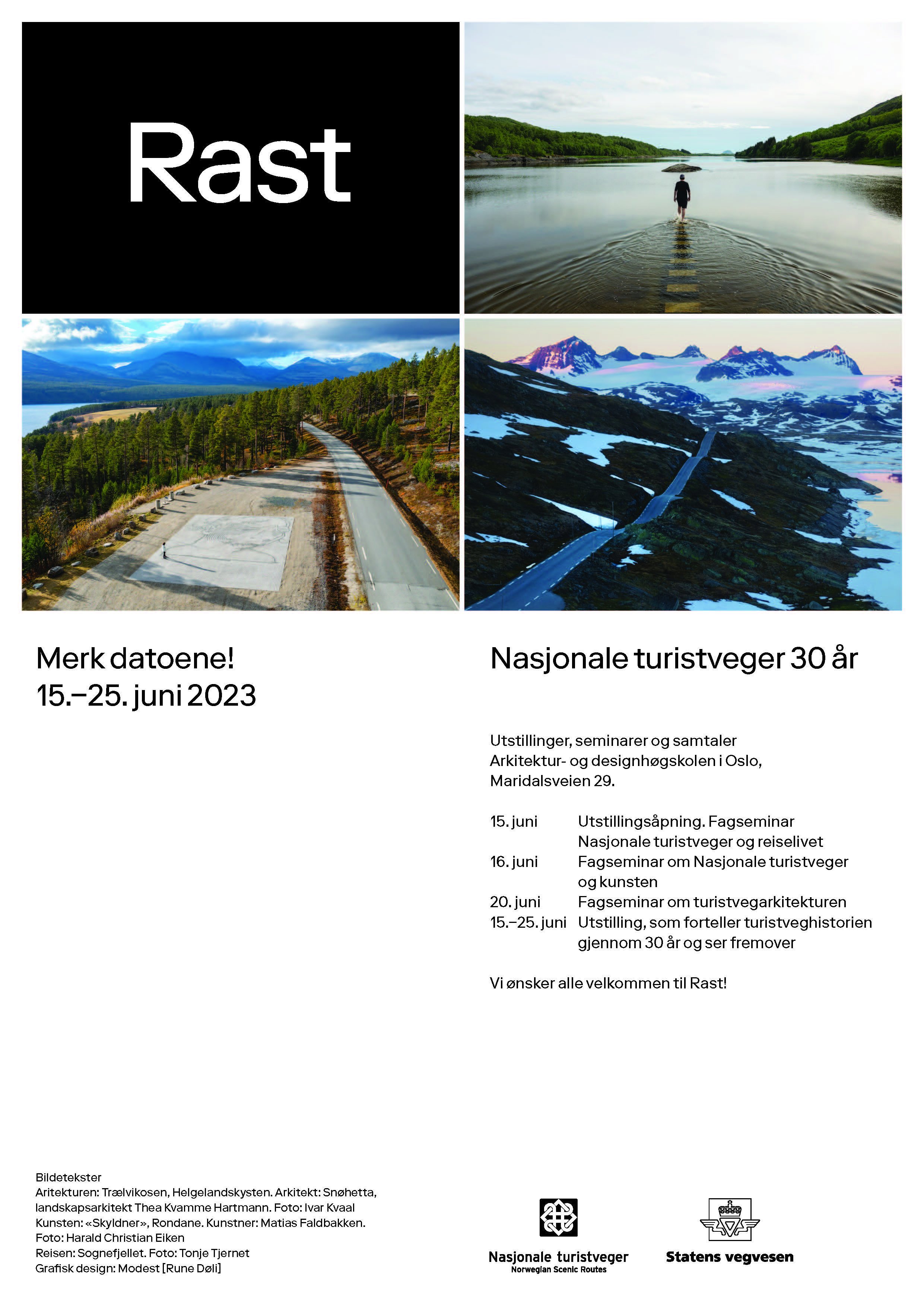 Tre større seminarer – med fri adgang etter påmelding –arrangeres som del av markeringen Rast. Et seminar om Nasjonale turistveger som del av norsk reiseliv holdes som en del av utstillingsåpningen 15.6. Kunsten i Nasjonale turistveger har så langt vært lite omtalt og blir presentert og diskutert på et seminar 16.6. Seminaret om arkitekturen i Nasjonale turistveger holds 20.6.